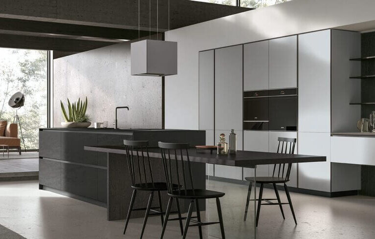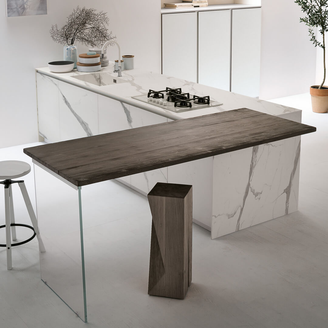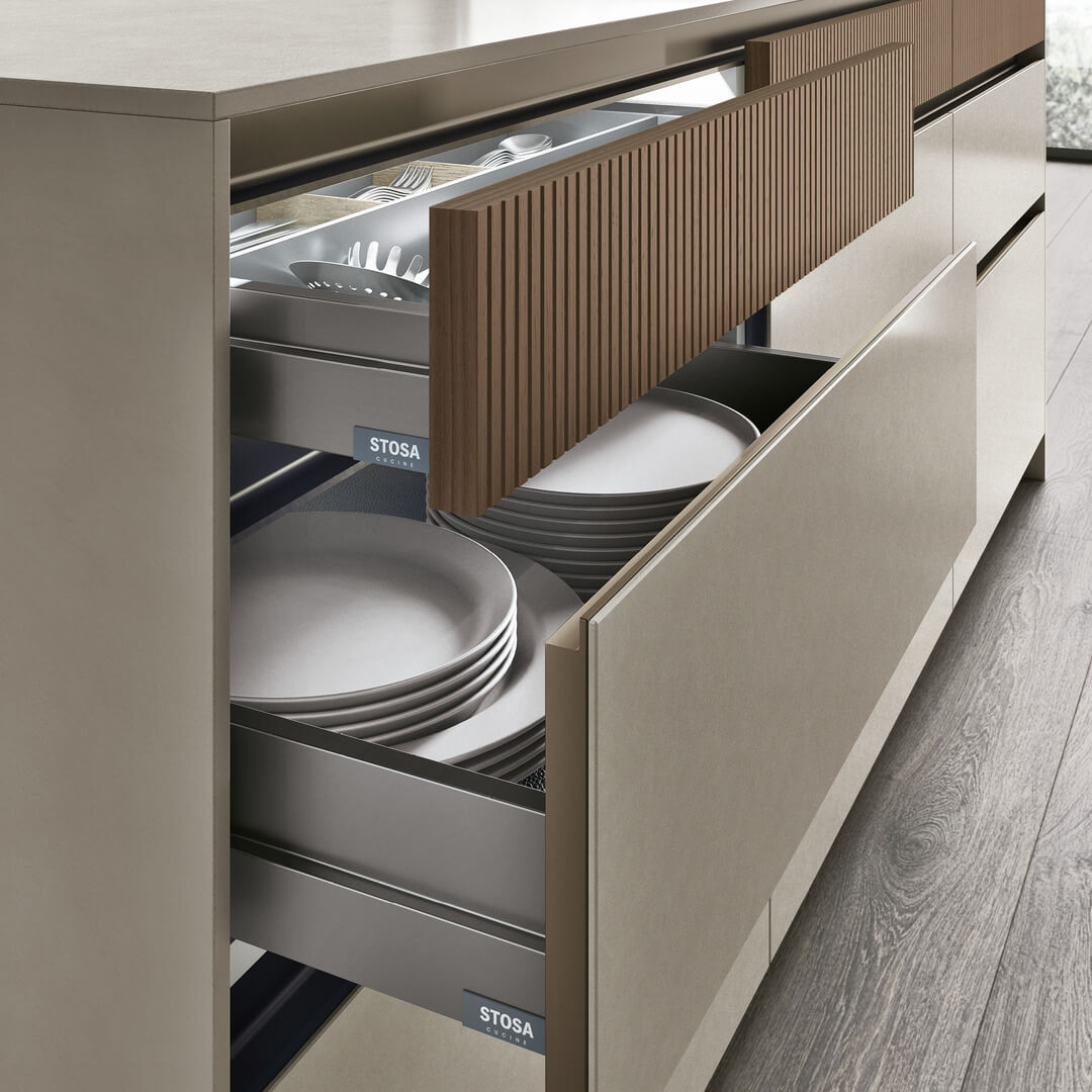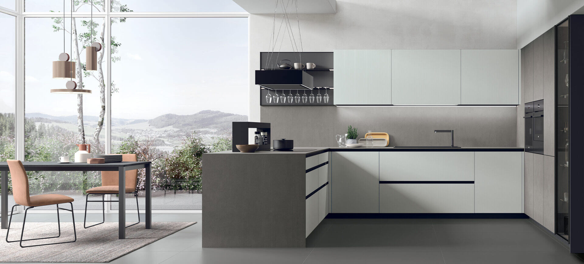 Aliant interpreta uno dei materiali più puri: il vetro. Una cucina che può essere integrata con ante e elementi eclettici per soluzioni inedite, un armonioso gioco di riflessi che esprime leggerezza visiva, dove il vetro rimane l’elemento protagonista. Può essere dotata di una vasta gamma di accessori che la rendono adatta per tutte le esigenze: come Tavinea Grass, un nuovo sistema organizzativo-innovativo all’interno di cassetti e cestoni per gli utensili della cucina. Cassetti con portaposate dalla moderne linee oblique, utilissimi e dal design raffinato. Una grande ricerca formale anche all’interno dei cestoni con eleganza e ordine, un mix di materiali durevoli come metallo e legno. Dettagli preziosi come Detroit, la barra luminosa a LED con sensore elettronico che permette l’accensione e lo spegnimento automatico della lampada alla chiusura del cassetto.