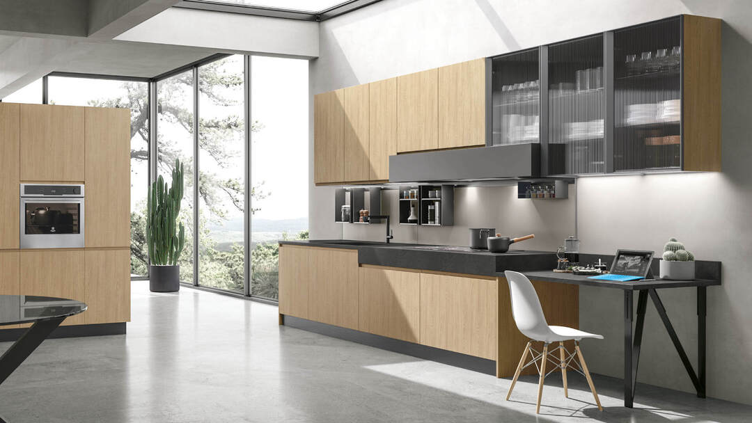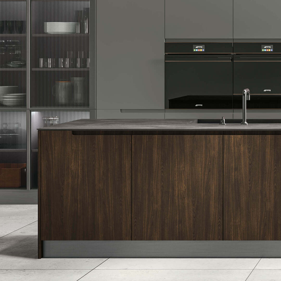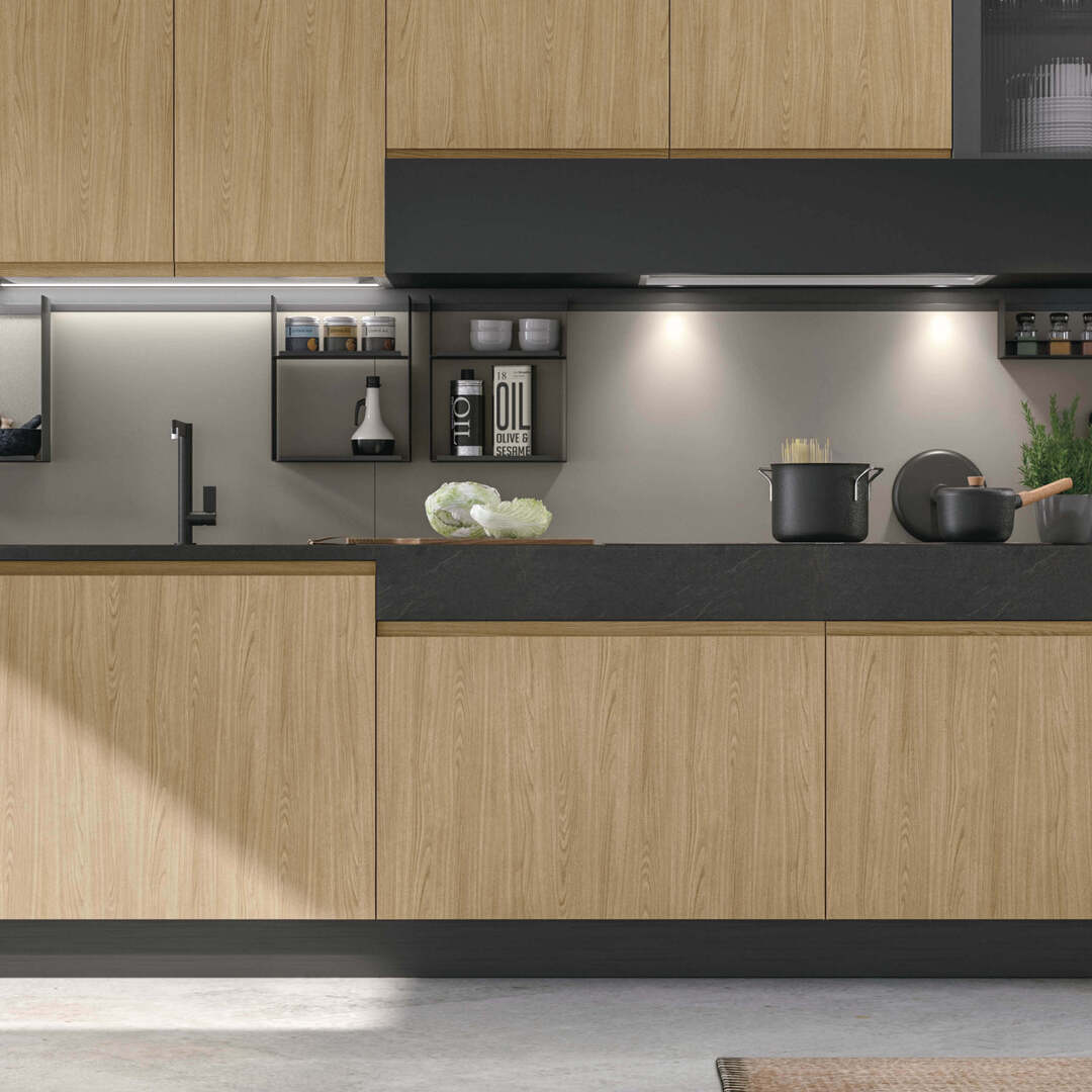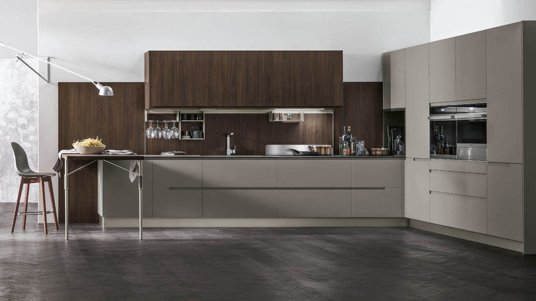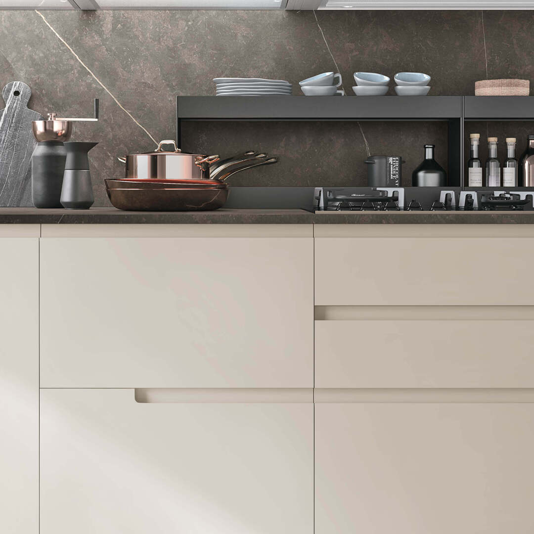 Pensata per un pubblico amante dello stile pulito e in grado di dare massimo risalto ai contrasti materici e cromatici delle finiture, Karma si distingue per l’anta con presa maniglia integrata che definisce e decora la cucina con tre tipologie di apertura: maniglia totale, maniglia parziale, contropresa maniglia, dettagli che contribuiscono a un look originale che al contempo garantisce massima funzionalità.