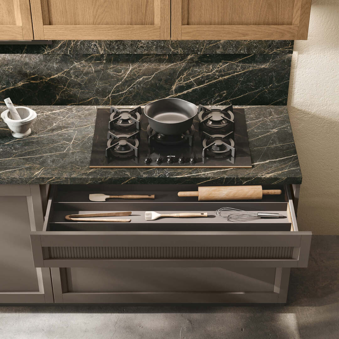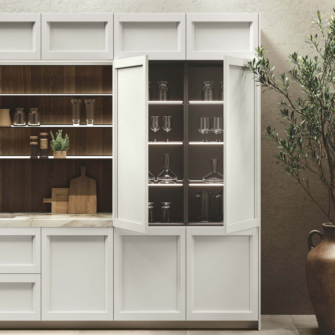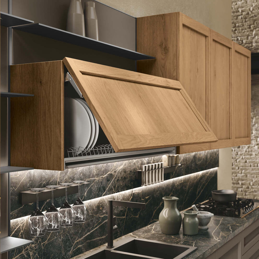 Ogni dettaglio è studiato per organizzare in modo ordinato e razionale le varie funzioni: dal cucinare al contenere. Ante, pensili, vetrine, cassetti e cestoni di varie misure si prestano ad accogliere tutto il necessario.