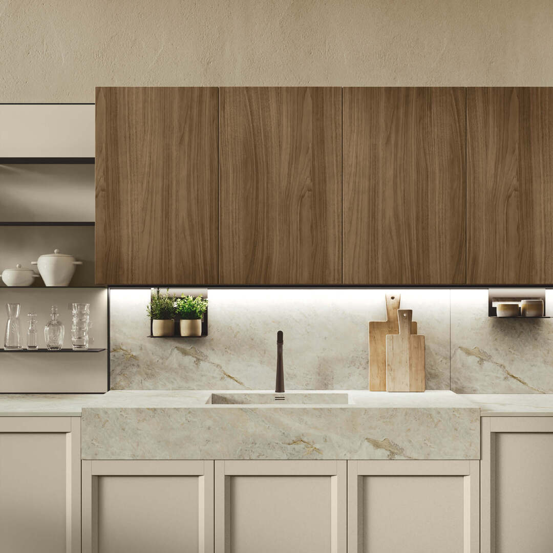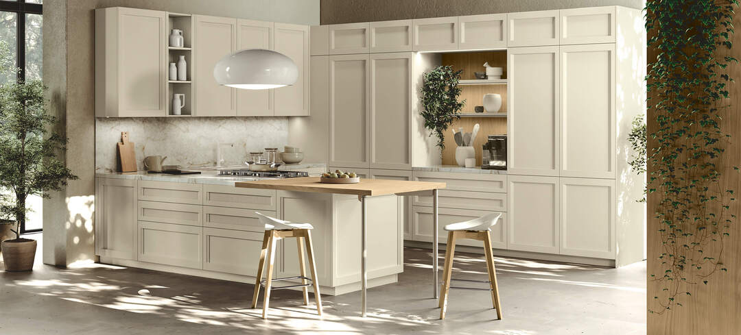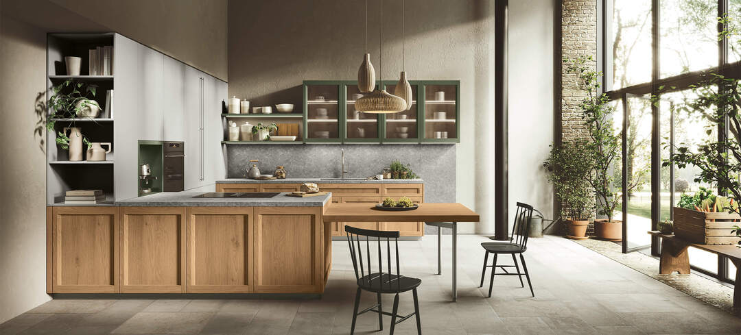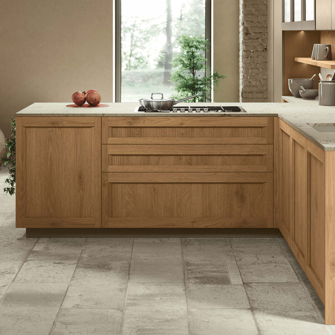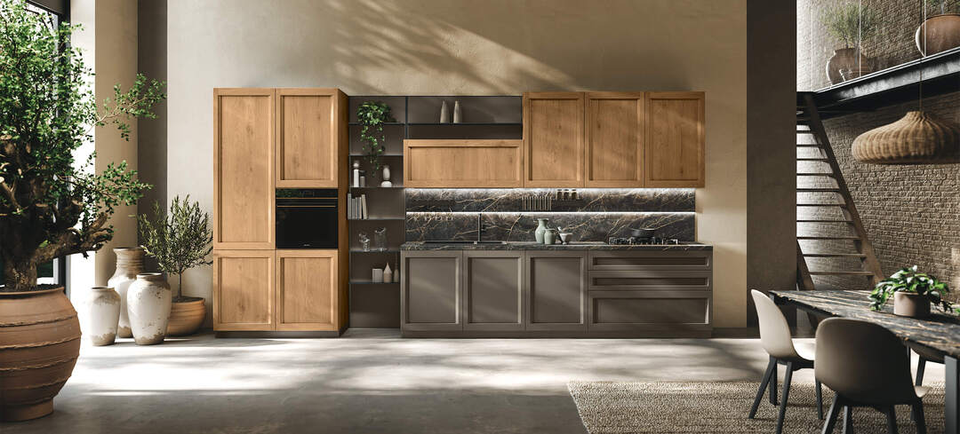 Ogni dettaglio è studiato per organizzare in modo ordinato e razionale le varie funzioni: dal cucinare al contenere. Ante, pensili, vetrine, cassetti e cestoni di varie misure si prestano ad accogliere tutto il necessario.