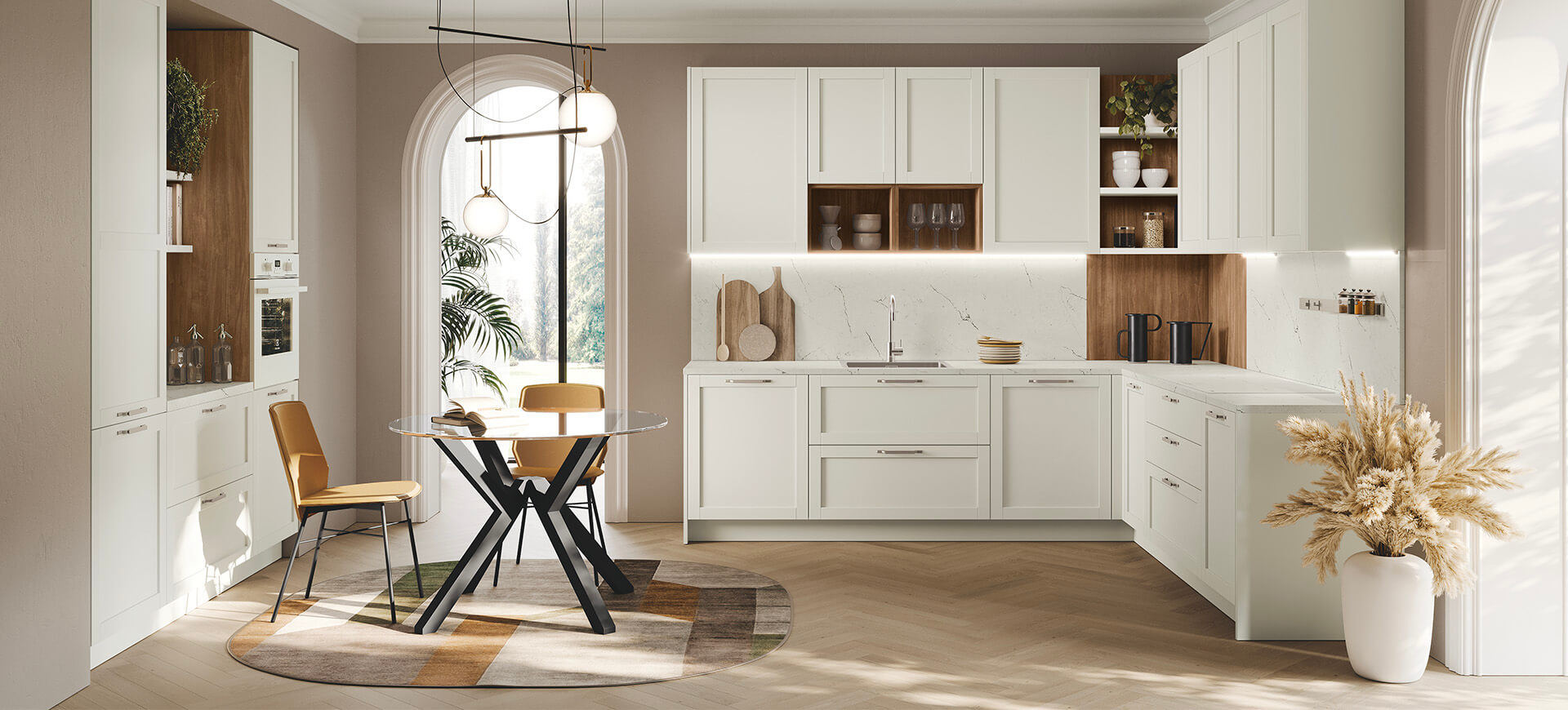 Un equilibrato gioco di volumi riesce a creare le atmosfere tipiche della tradizione, che si armonizzano con naturalezza a soluzioni estetiche contemporanee, semplici e razionali, di straordinaria flessibilità compositiva.