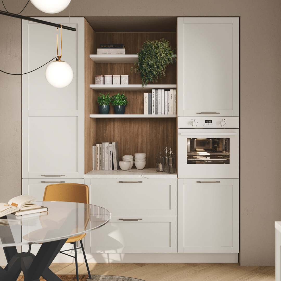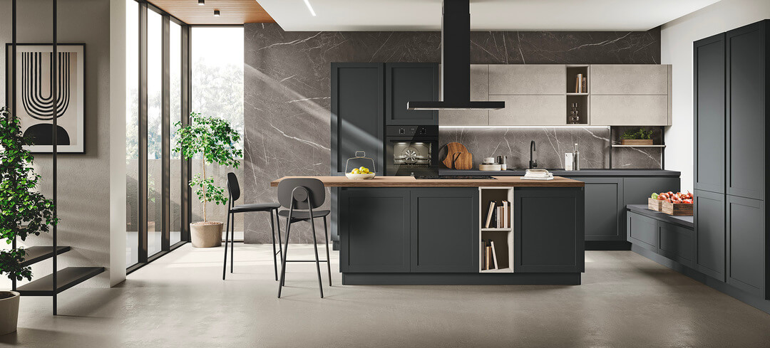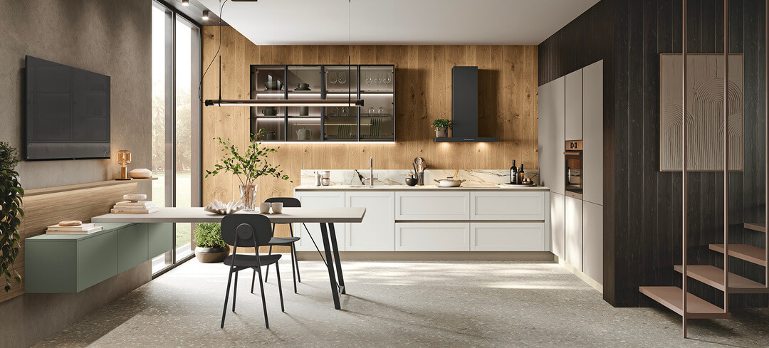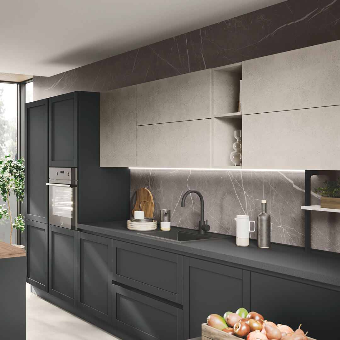 Sveva è caratterizzata da ante a telaio, realizzate con materiali e colori che si rifanno a suggestive atmosfere tattili ed emotive della natura, che vengono abilmente accostate alle ante lisce del modello Kaya per progettare ambienti conviviali e unici.