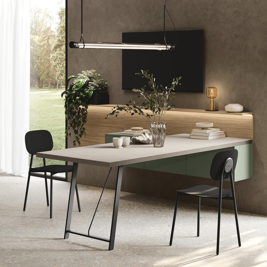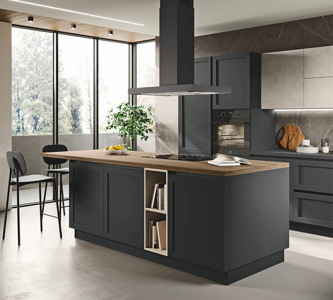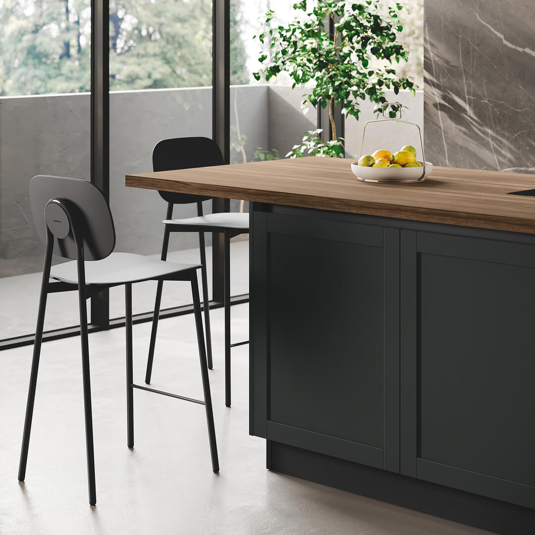 Sveva è caratterizzata da ante a telaio, realizzate con materiali e colori che si rifanno a suggestive atmosfere tattili ed emotive della natura, che vengono abilmente accostate alle ante lisce del modello Kaya per progettare ambienti conviviali e unici.