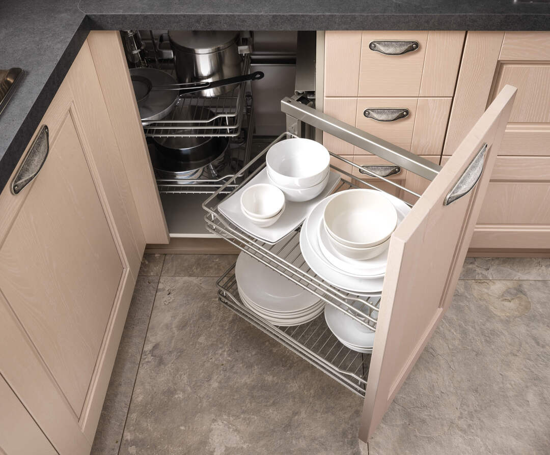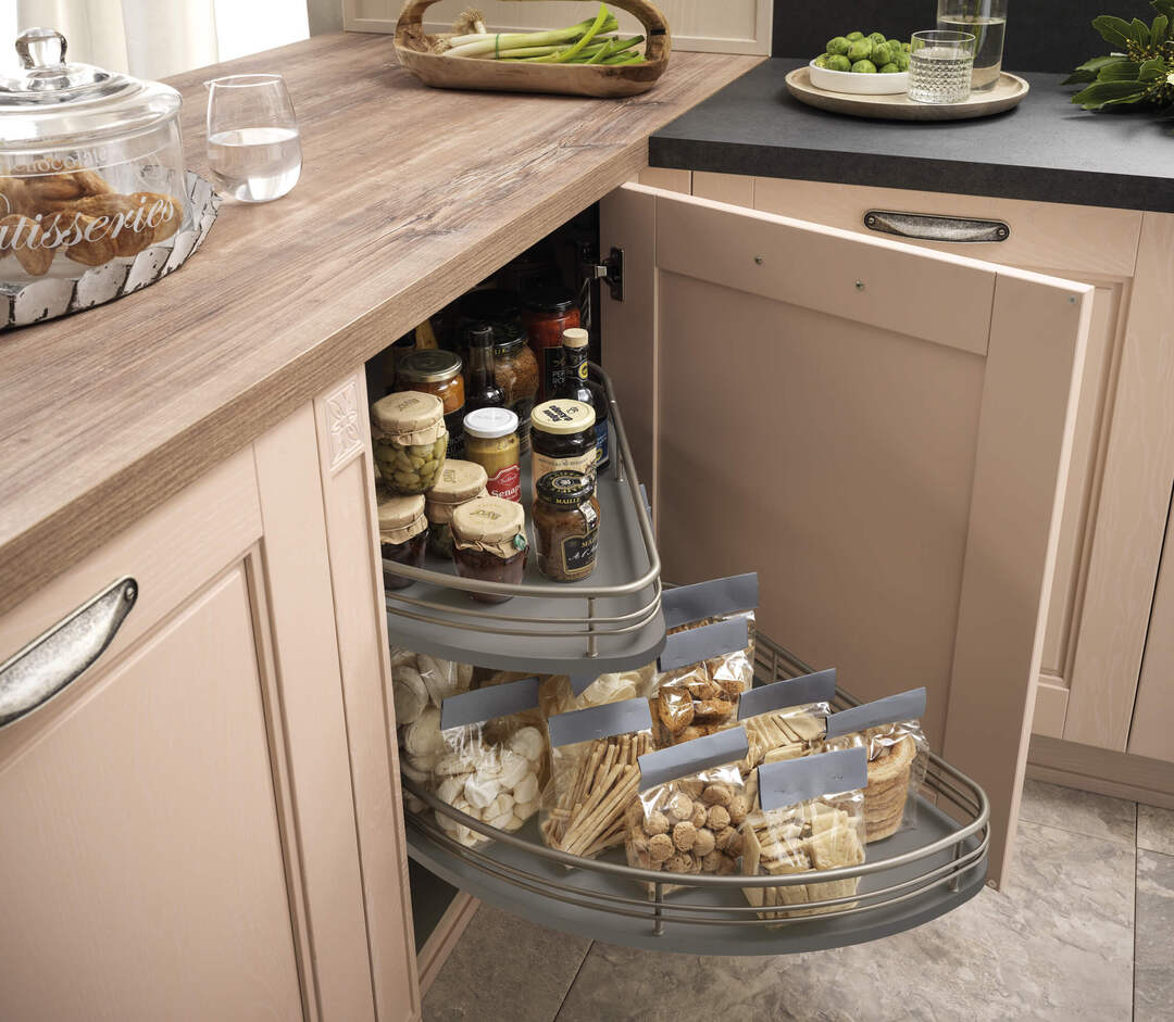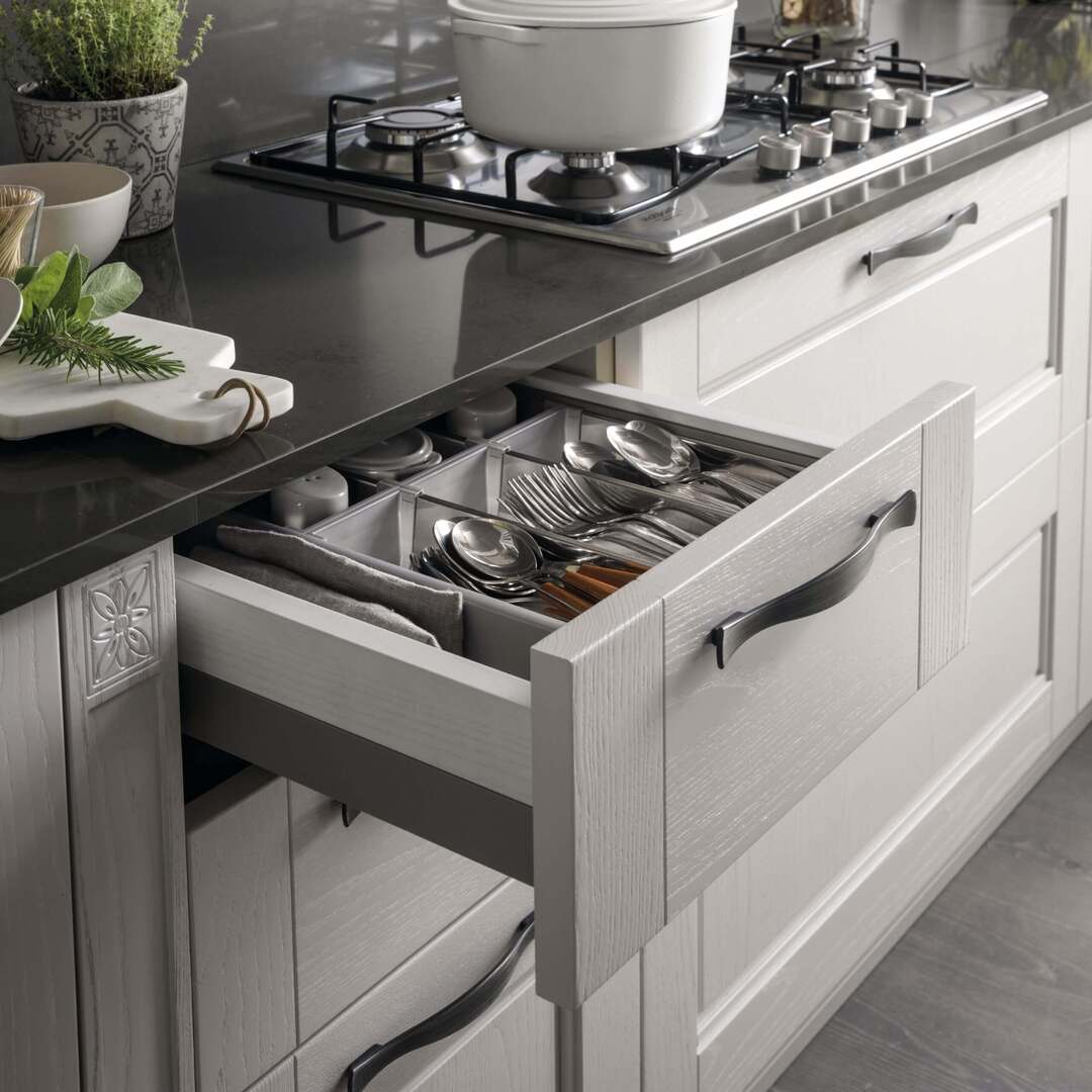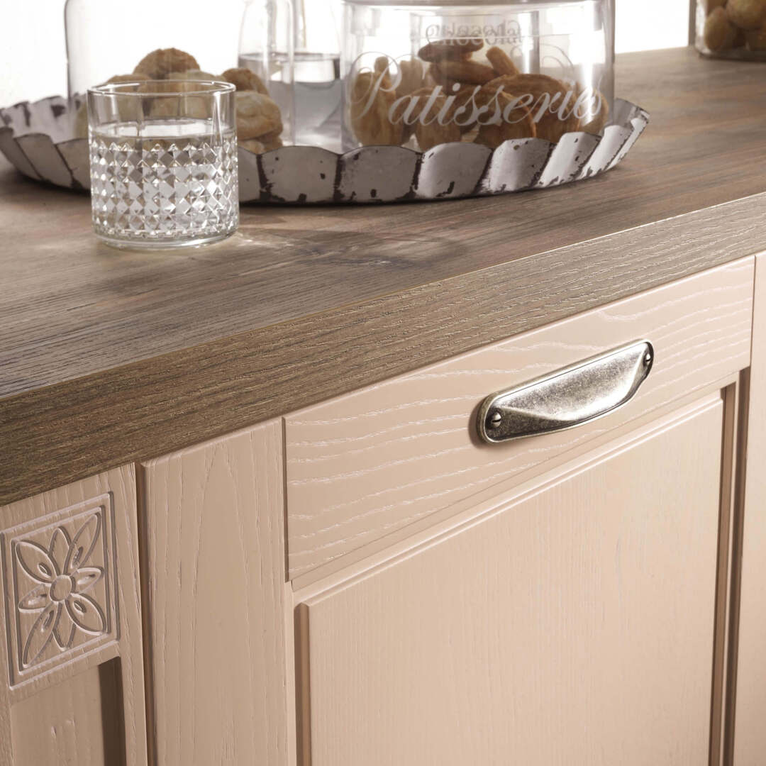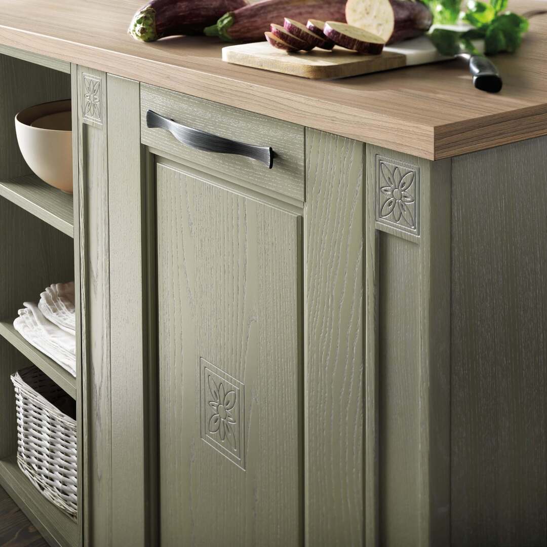 Perla, Verde Salvia, Cipria e Jersey sono le tonalità pastello scelte per vestire il legno di frassino delle ante, quelle piene, in cui i dettagli materici rimangono in evidenza, e quelle con vetro effetto tessuto, che giocano con le trasparenze. Le bugne, le decorazioni floreali incise e l’effetto decapè delle superfici permettono la creazione di ambienti rilassanti che ricordano le atmosfere bucoliche tipiche dei paesaggi rurali, rivisitandole in una chiave non convenzionale. Altro dettaglio a completamento sono le maniglie a conchiglia, proposte in finitura argento antico, grafite e grafite graffiato. Virginia, come tutte le cucine di Stosa, risponde perfettamente alle esigenze di personalizzazione sia estetica, che di organizzazione degli spazi.