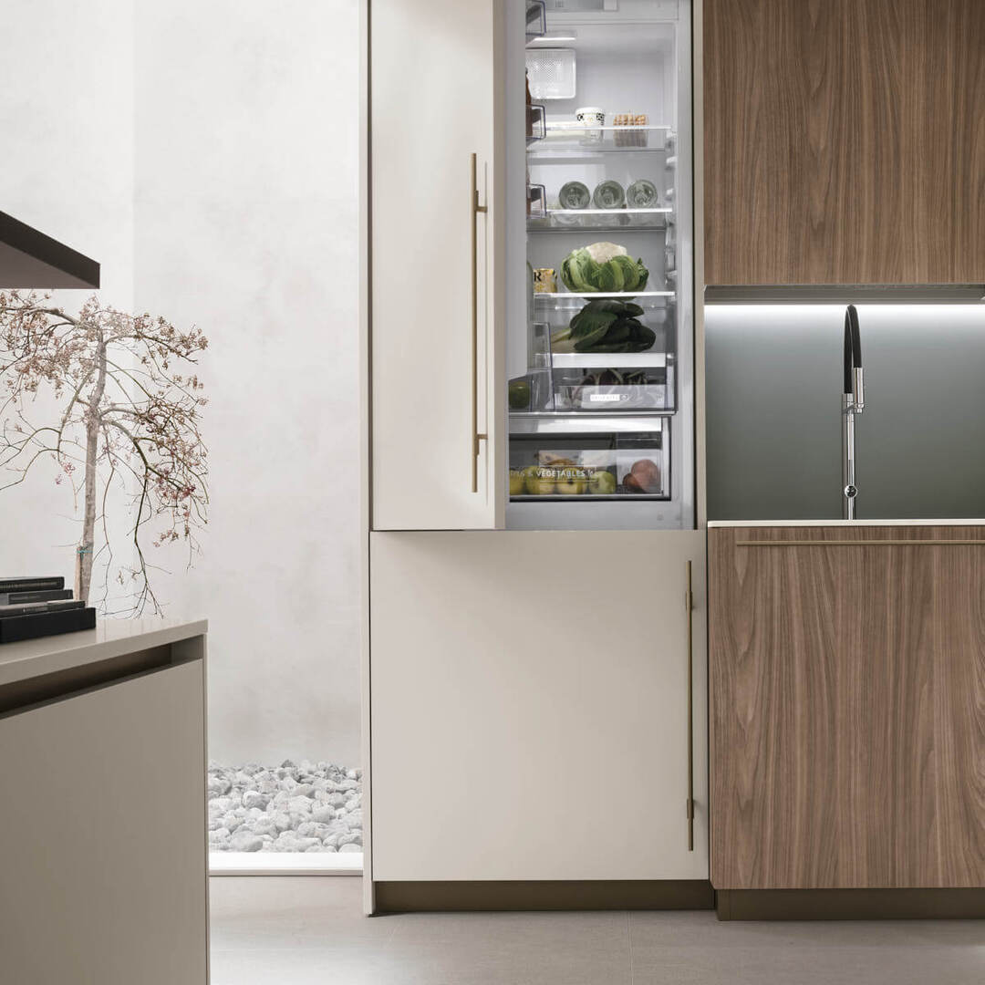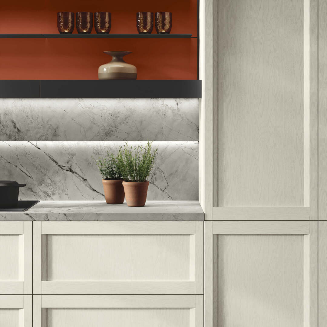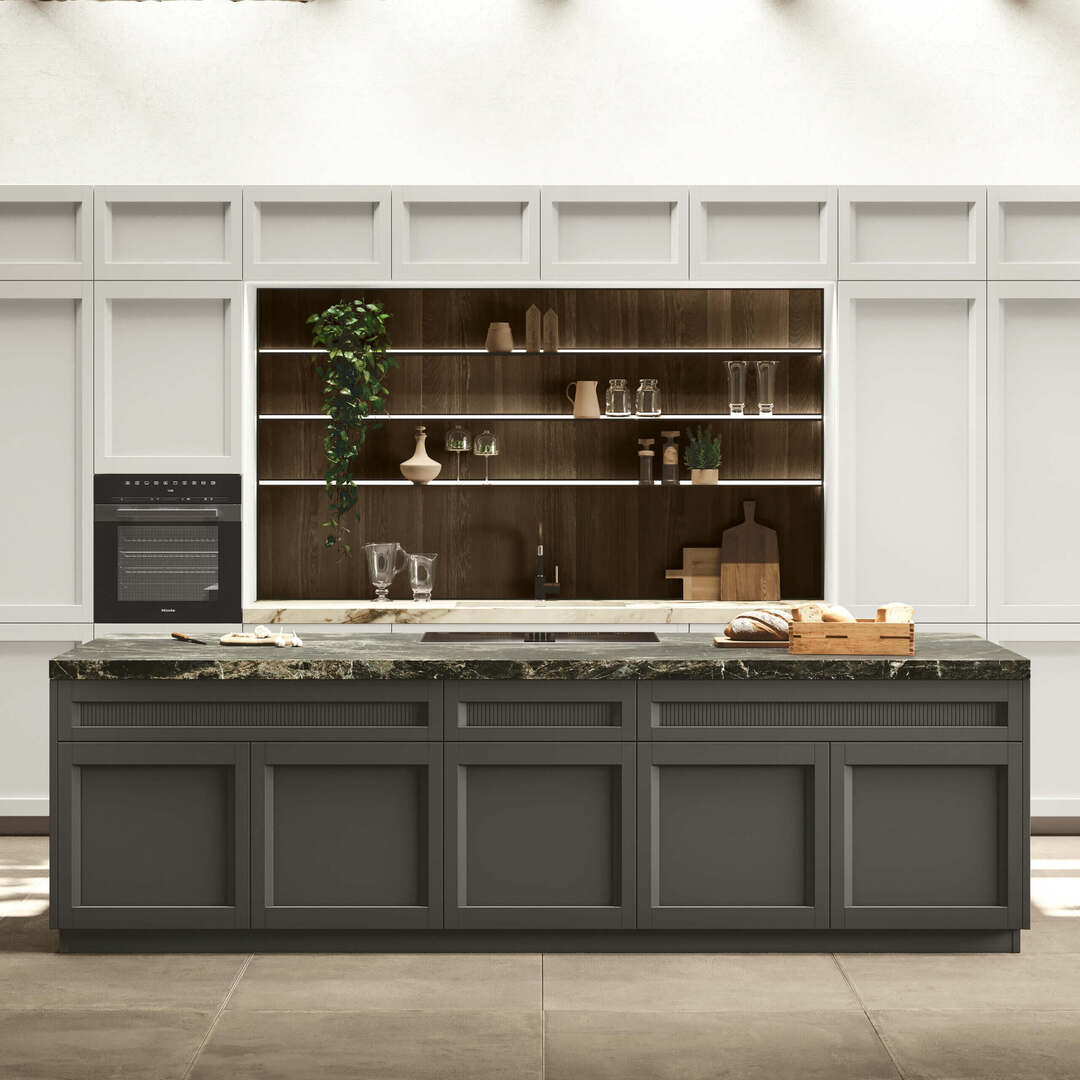Linee essenziali che arredano senza appesantire: gli scaffali sono elementi capaci di completare la cucina e la zona giorno con soluzioni dinamiche. Ideali per esporre, contenere e scandire gli spazi, si integrano con i moduli della cucina creando un effetto di coerenza visiva e funzionale.